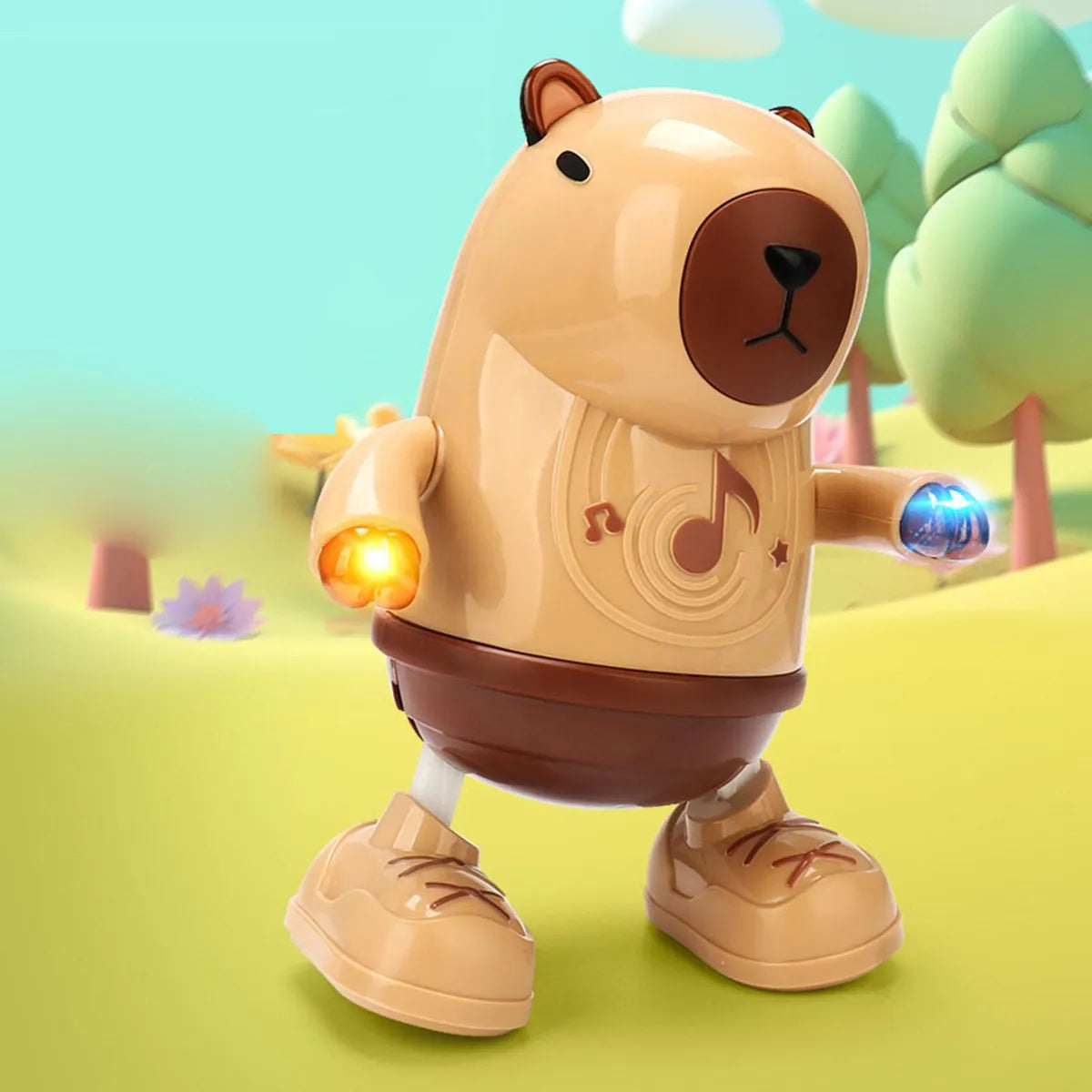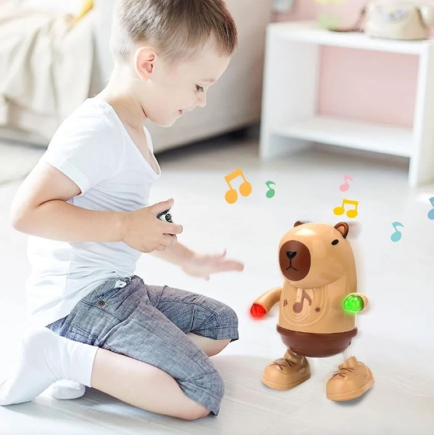 CARACTERISTICAS: Juguete capibara bailarín musical Encantador y divertido canta y baila El capibara combina movimientos de baile al ritmo de melodías alegres Equipado con luces que parpadean al compás de la música Con materiales suaves al tacto y colores vibrantes Funcionalidad interactiva, que estimula la imaginación y el amor por la música en los más pequeños.
