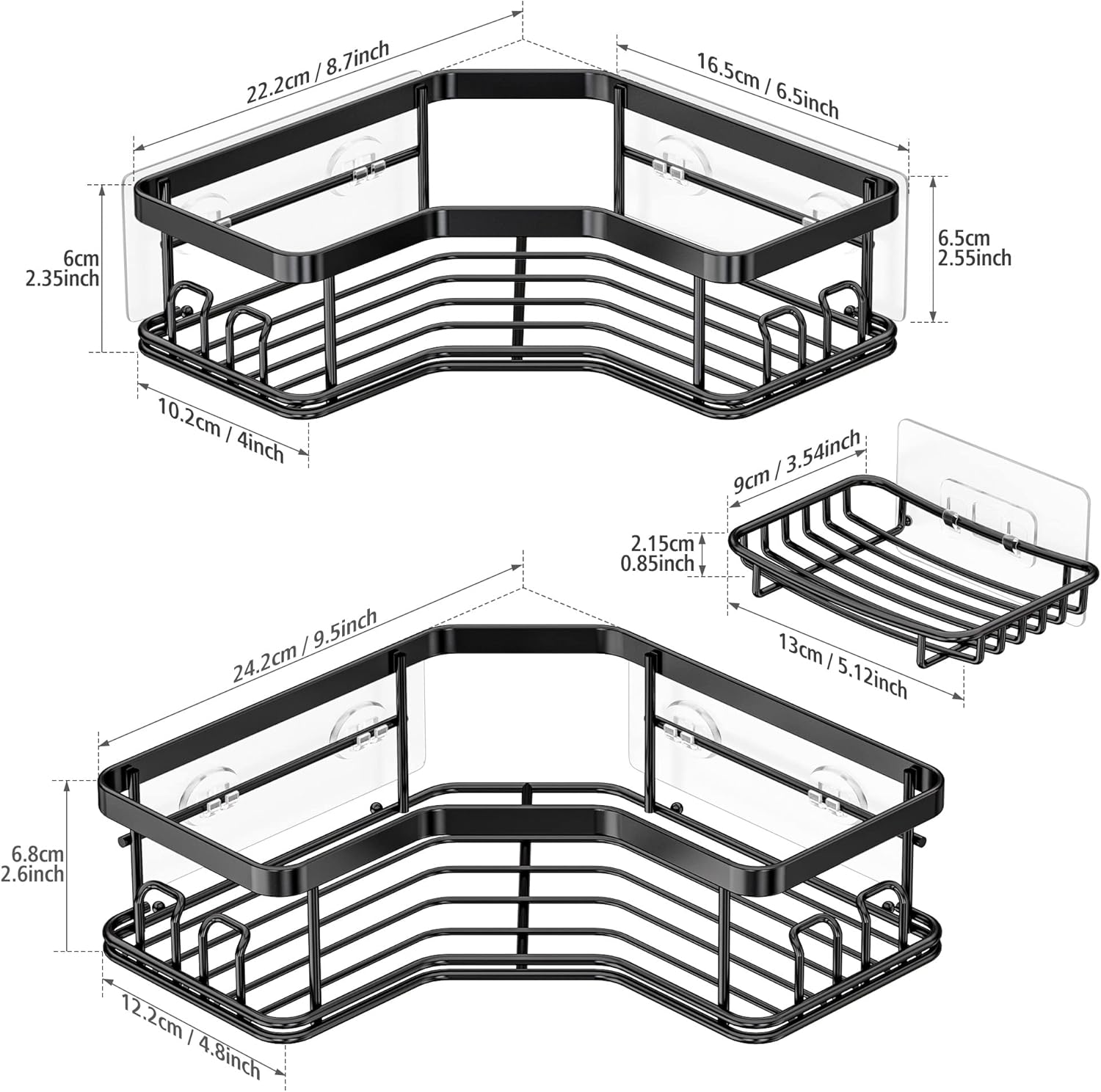 Estructura resistente en metal con acabado anticorrosión, ideal para ambientes húmedos. Instalación sin perforaciones, con adhesivos de alta fijación para proteger tus paredes. Capacidad amplia para botellas grandes, frascos y accesorios de baño. Incluye bandeja jabonera independiente para mantener el jabón seco y limpio