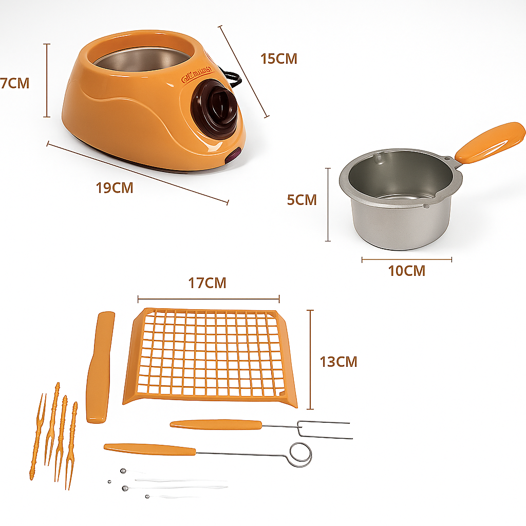 - Contenido del paquete: Olla de derretir, espátula, 6 moldes variados, 10 palillos de plástico para fondue, 10 tenedores de plástico para fruta, tenedor en espiral y tenedor plano para manipular chocolate.