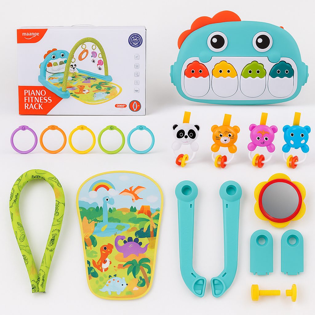 Gimnasio perfecto para actividades de bebé: un gran centro de actividades temáticas de dinosaurios para bebés, con 5 juguetes colgantes desmontables, 2 juguetes para masticar bebés y música de piano elegante, juguetes musicales brillantes que llaman la atención de los niños. Alfombra de juego para bebé hecha de material seguro y agradable al tacto, lavable y cómoda. El bebé puede acostarse o jugar en la alfombrilla de gimnasio incluso cuando está desnudo.
