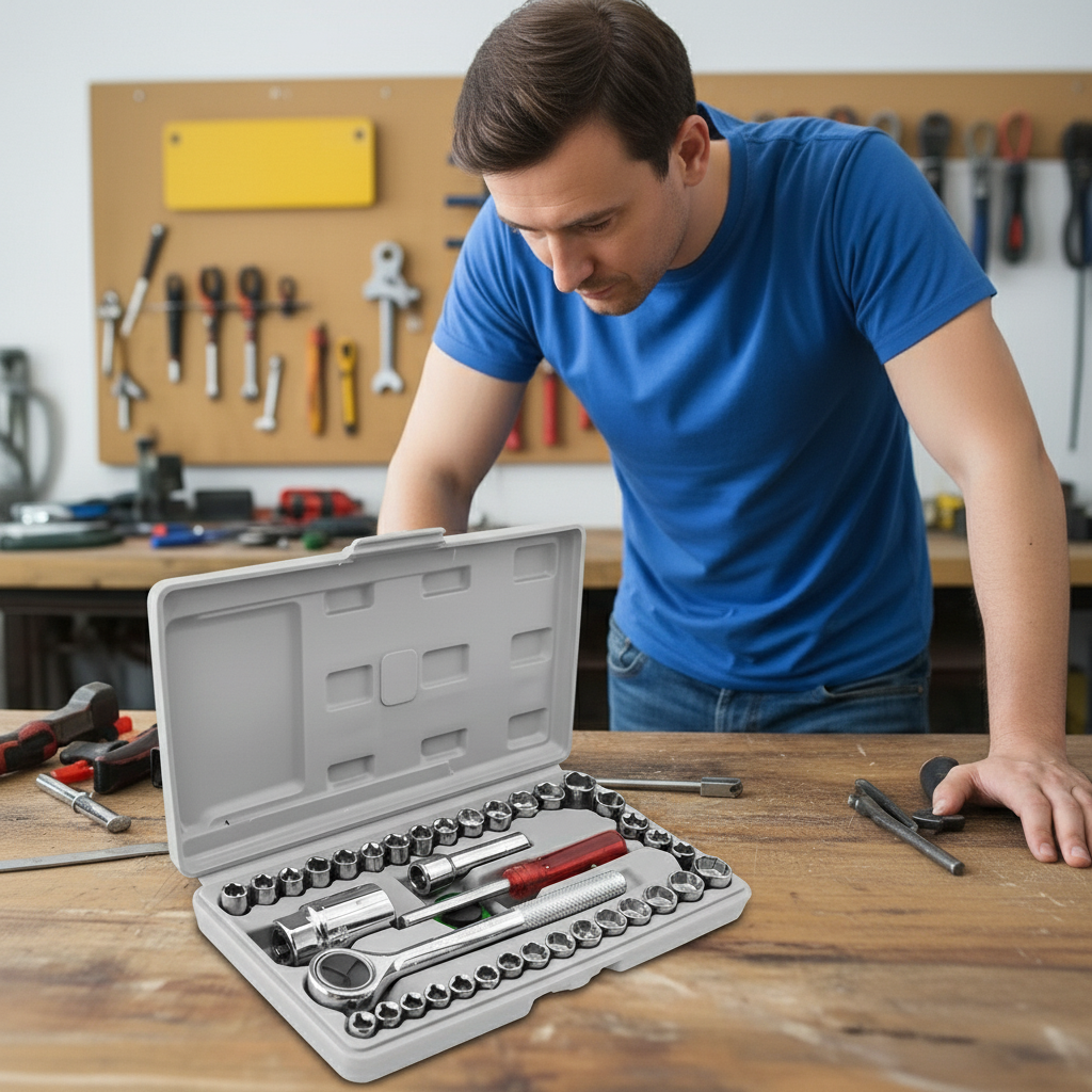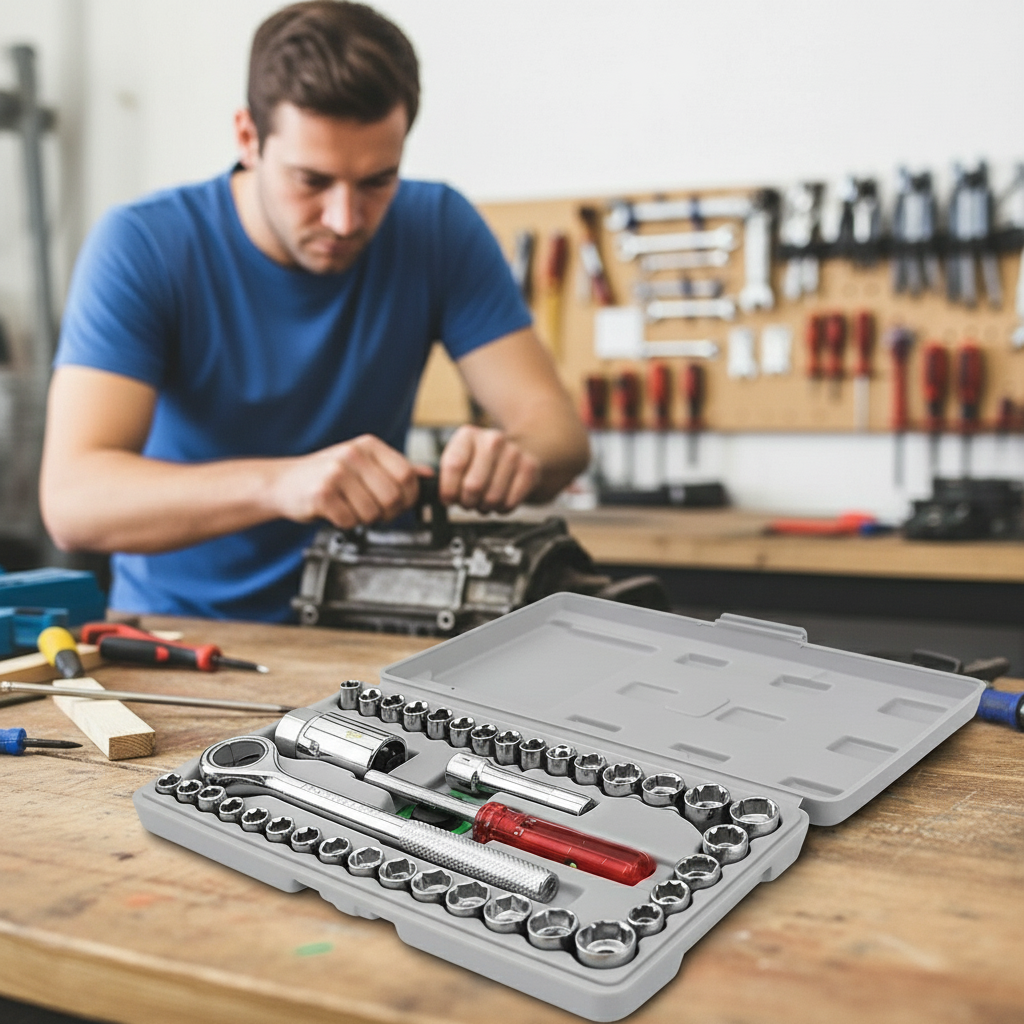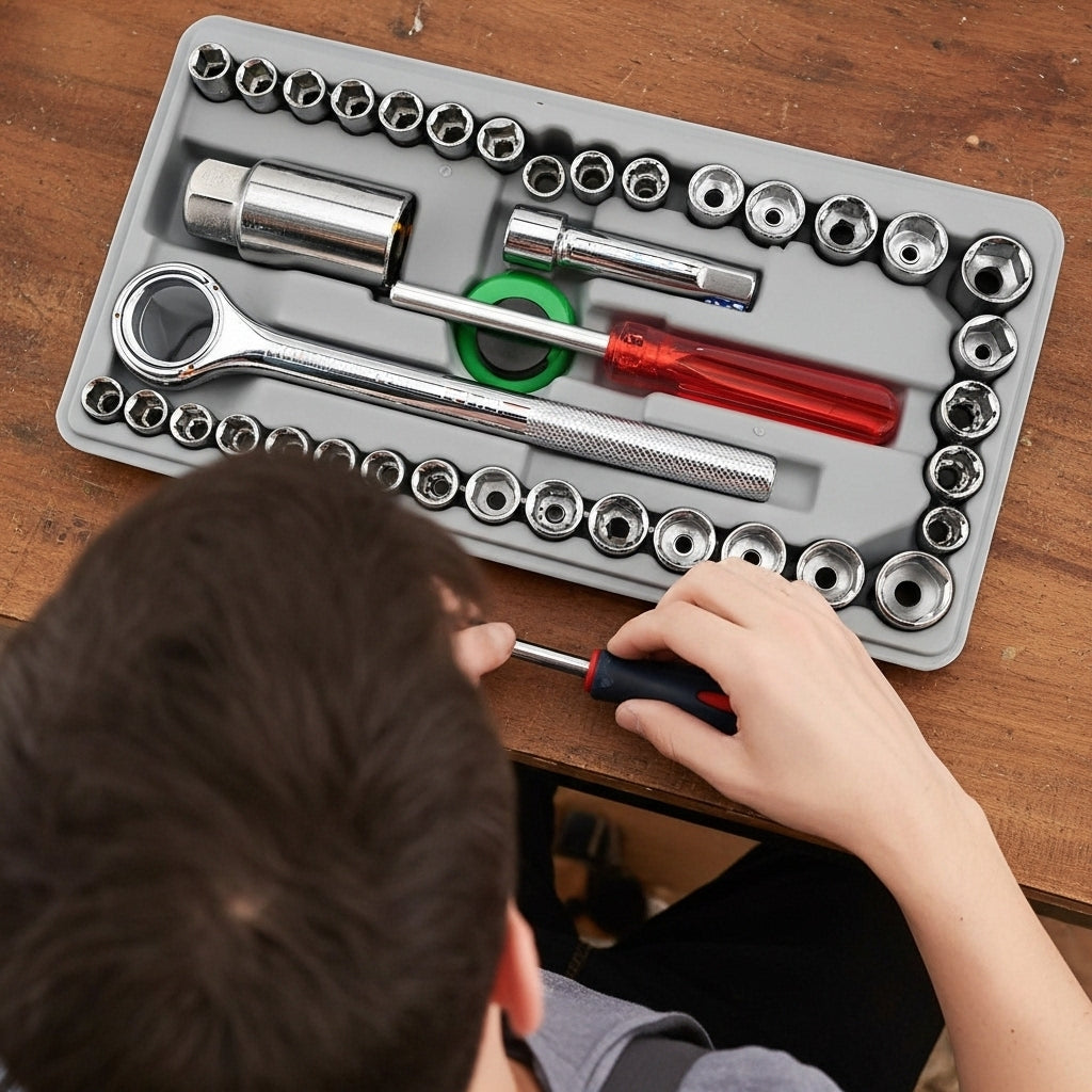 Herramientas Carros Juego De Raches Copas Kit Herramientas Juego de raches de 40 piezas14PC 1/4 " Dados4, 4.5, 5, 5.5, 6, 6.5, 7, 7.5, 8, 9, 10, 11, 12, 13m m14PC 1/4 " Dados5/32 ", 3/16 ", 7/32 ", 1/4 ", 9/32 ", 5/16 ", 11/32 ", 3/8 ", 13/32 ", 7/16 ", 15/32 ", el 1/2 ", 17/32 ", 9/16 "3PC 1/4 " Dados (8PT): 1/4 ", 5/16 ", 3/8 "1PC 3/8 " Dados 5/8" 1PC 3/8 " Dados 15m m1PC 3/8 " manija de DR. Ratchet1PC 3/8 " barra de DR. Extensión: 3 " 1PC 3/8 " Dado del enchufe de DR. Spark: 21mm1PC 1/4 " manija de DR. Spinner: 6 "