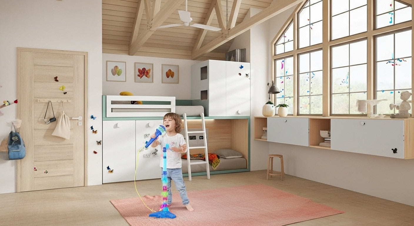 Micrófono Con pedestal y luces de colores. Para jugar a cantar y sentirse como una estrella. Conecte su reproductor de MP3 o teléfono inteligente para cantar con sus canciones favoritas (reproductor de MP3 y/o teléfono inteligente no incluido).