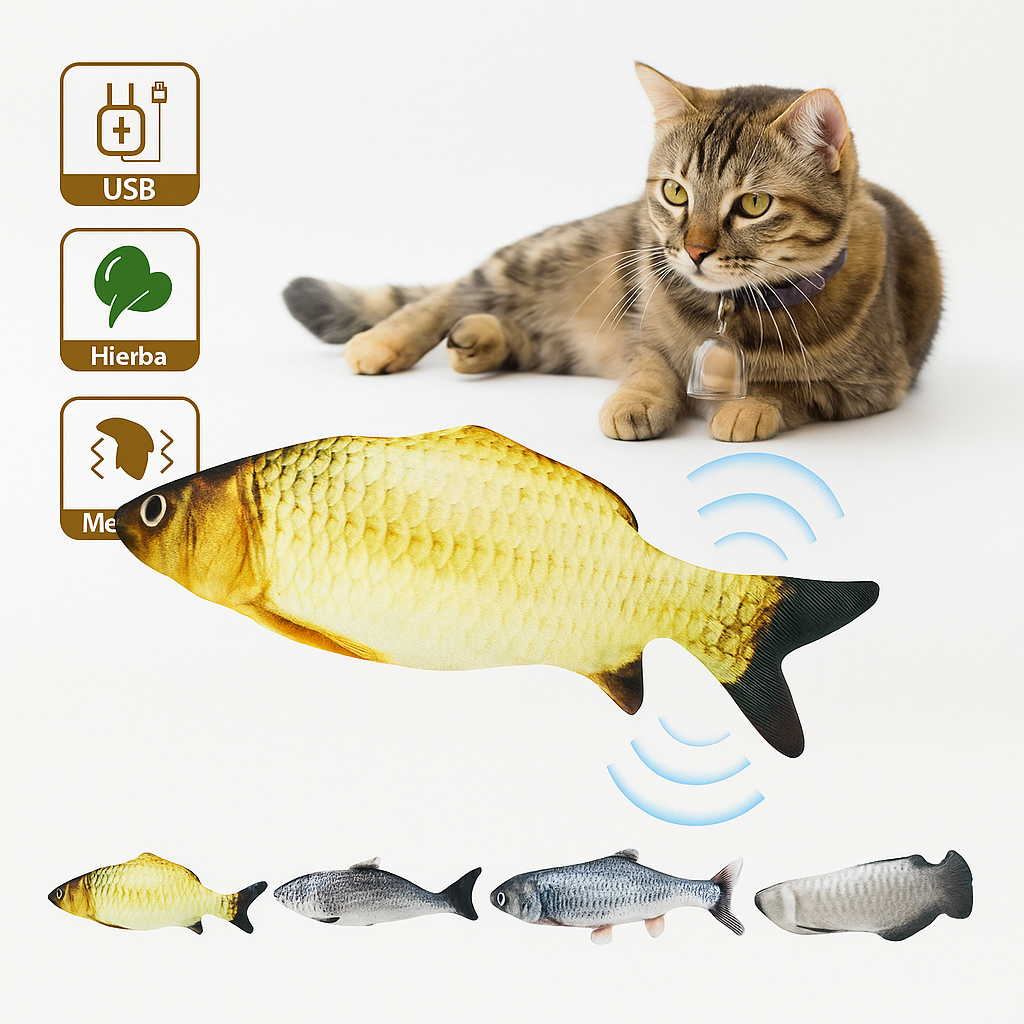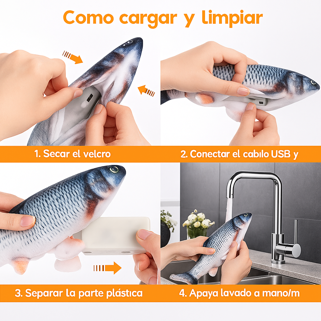 Incluye cable USB. El motor recargable es extraíble para facilitar la limpieza del juguete. Instrucciones de uso: abrir el compartimento en el vientre del pez, activar el interruptor y tocar el vientre para iniciar el movimiento; la luz roja indica que está cargando y se apaga cuando la carga está completa.