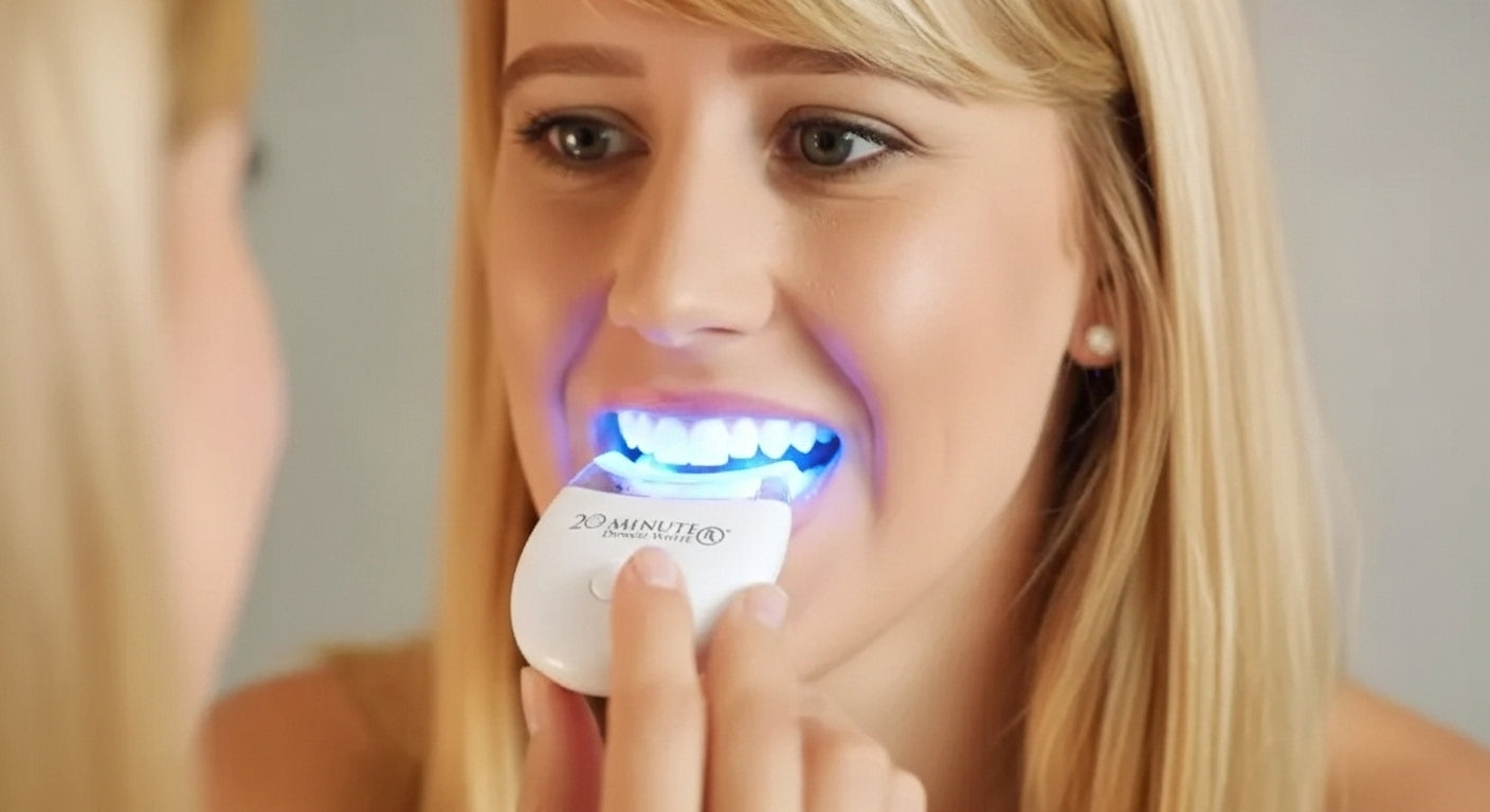 El 20 Minute Dental White RX es un kit de blanqueamiento dental profesional que le brinda tecnología de dentista, en la comodidad de su hogar. Ahora puede blanquear sus dientes hasta en 8 tonos, en tan solo 20 minutos. Elimine años de coloración amarillenta o manchas de café, vino y humo con este increíble sistema de tres pasos.1.La luz del acelerador de blanqueamiento dental mejora el proceso de blanqueamiento mientras elimina las manchas en la superficie del diente y se blanquea más rápido.