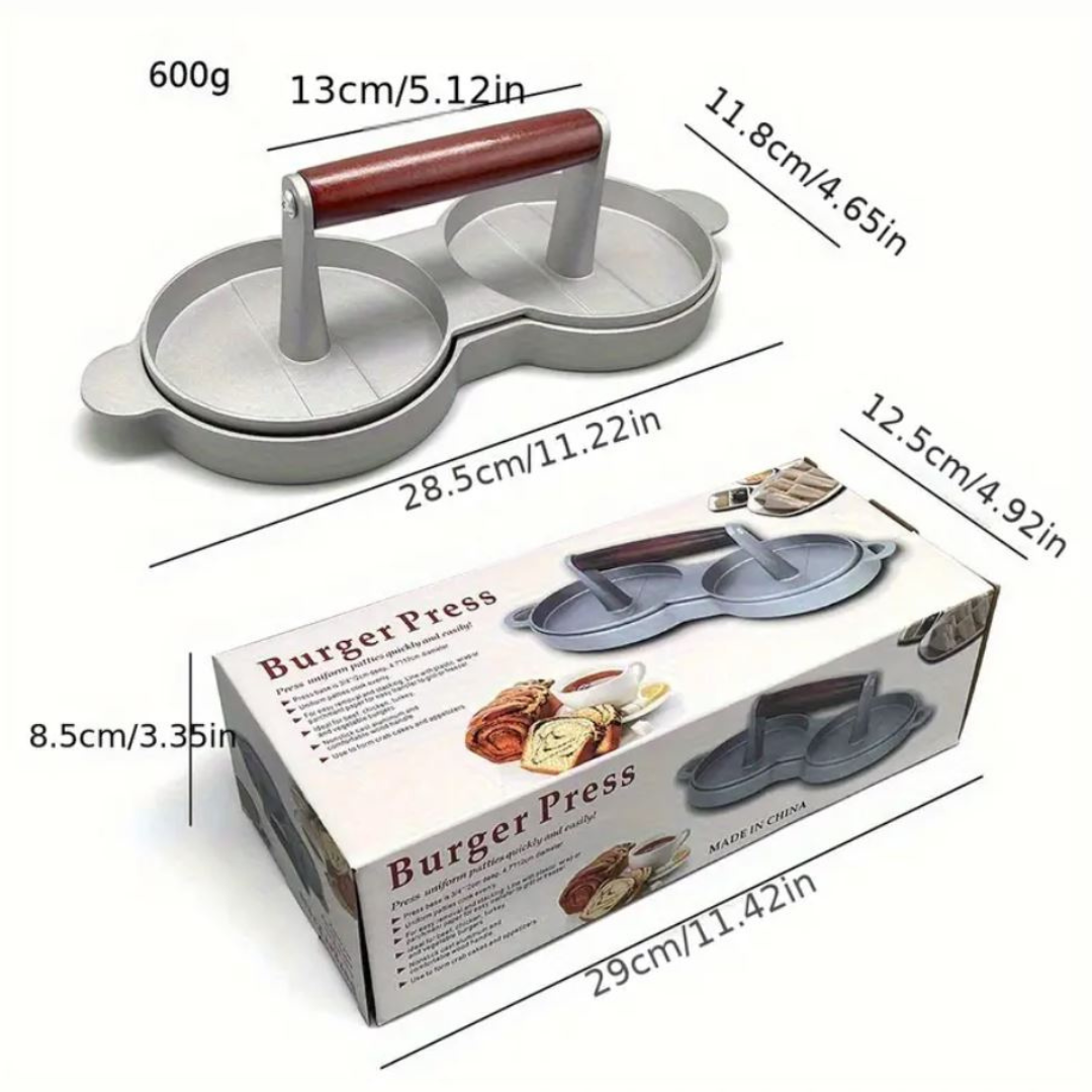 🍔 Molde doble Ahorra tiempo preparando dos hamburguesas al mismo tiempo, perfectas para asados, reuniones o cenas rápidas.