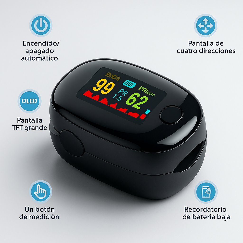 🩺 Oxímetro Digital de Dedo con Pantalla OLED – Medición Precisa en Segundos Este oxímetro digital de dedo es un dispositivo práctico y confiable que permite medir la saturación de oxígeno en sangre (SpO2) y la frecuencia del pulso de manera rápida y sencilla. Ideal para uso adulto y pediátrico, brinda resultados claros en tan solo 8 segundos.
