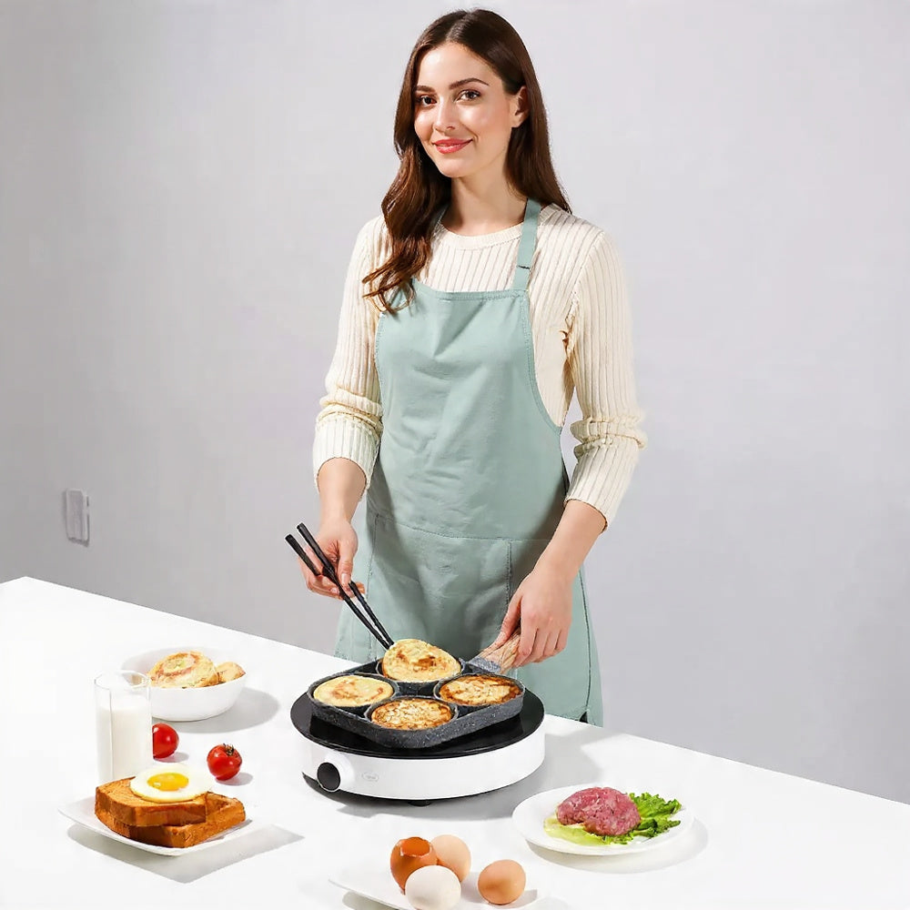 4 espacios independientes, Antiadherente para fácil limpieza, Mango resistente al calor, Ideal para desayunos y comidas rápidas, Ahorra tiempo y disfruta de preparaciones más organizadas.