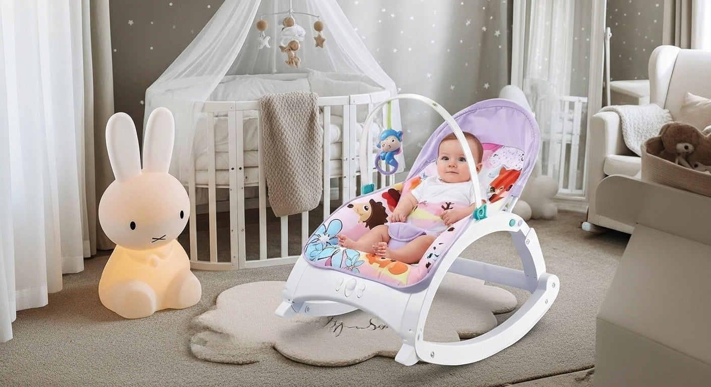 Funda lavable: Fácil de retirar y limpiar.- Diseño moderno y seguro: Con arnés de 3 puntos y base antideslizante. Versatilidad en cada etapa: Mecedora para bebé: Perfecta para los primeros meses de vida.